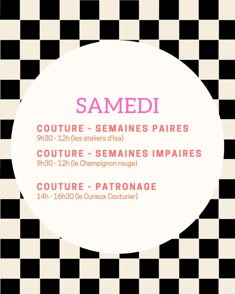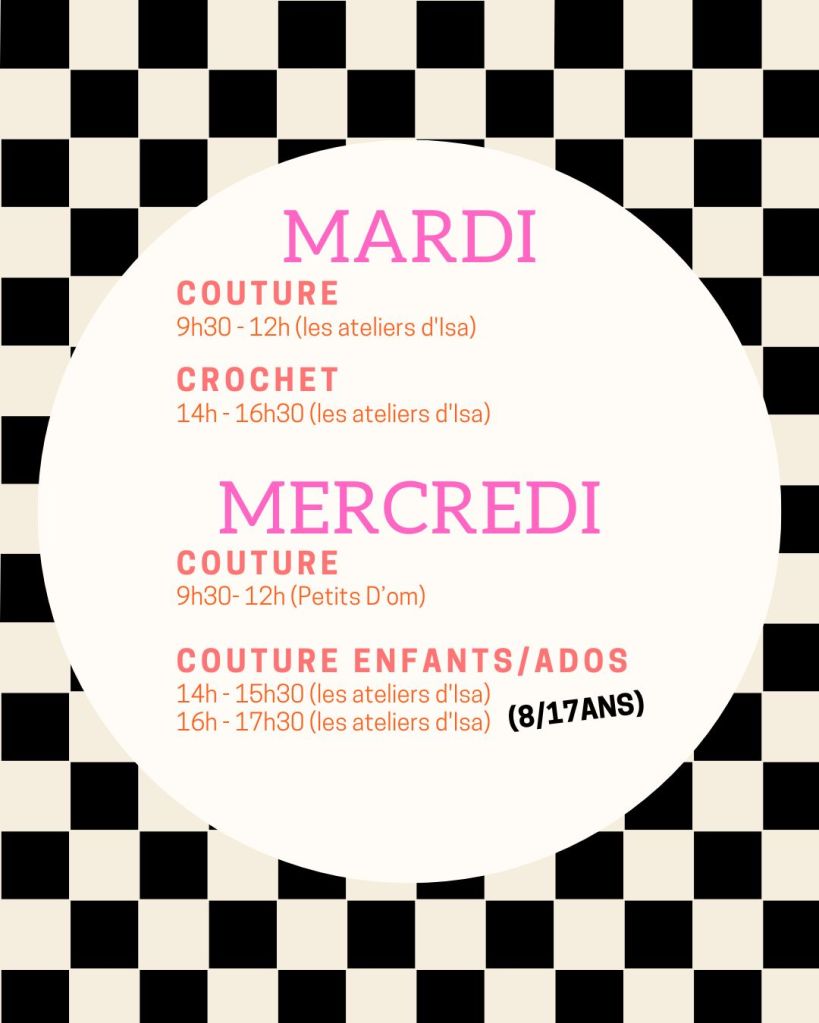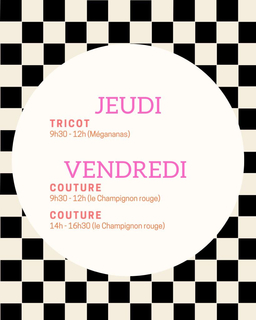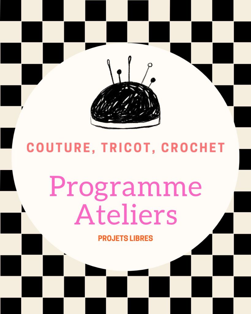 Du mardi au samedi, différent(e)s intervenant(e)s seront présent(e)s sur des plages entre 1h30 à 2h30, en cours collectifs ou individuels dans un espace atelier aménagé où vous pourrez venir tricoter, crocheter ou coudre avec votre machine ou profiter de machines mises à disposition.